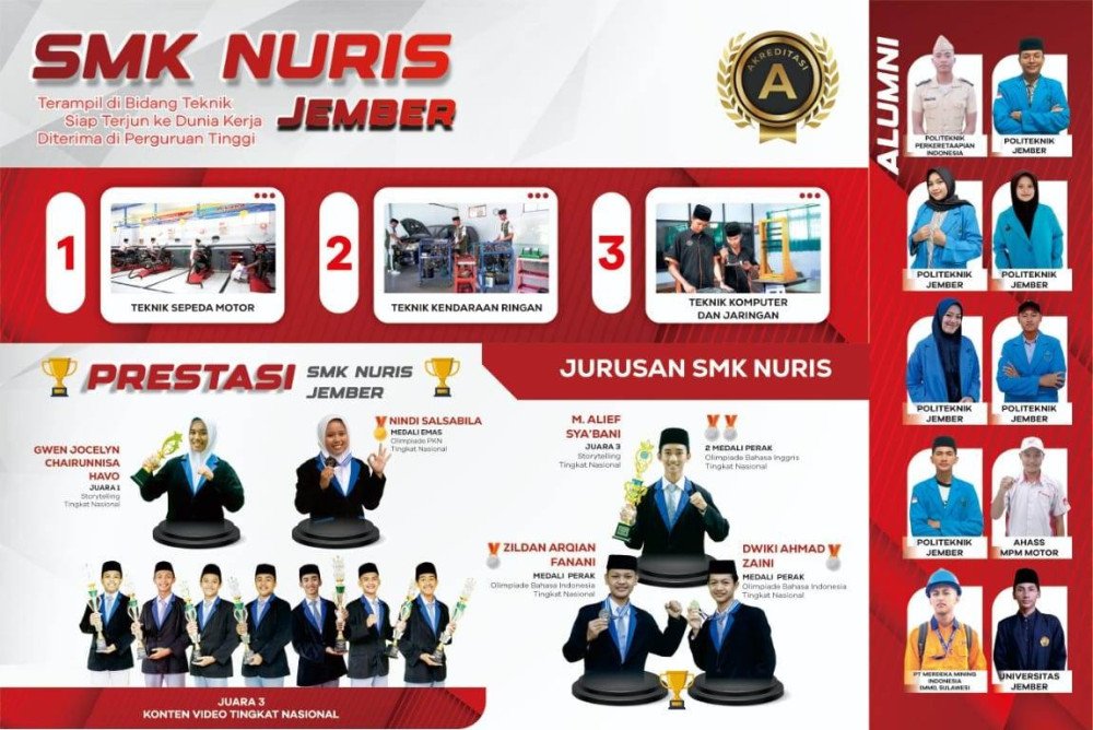 Inilah yang menjadikan SMK Nuris sebagai salah satu SMK terbaik se Kabupaten Jember, dengan jumlah siswa tahun ini 444 siswa. Hebatnya, alumni SMK Nuris bisa diterima di beberapa Universitas bergengsi, seperti Poltek Jember (Politeknik Negeri Jember), UNEJ (Universitas Jember), UM (Universitas Negeri Malang), dan lulusannya langsung bisa bekerja di beberapa perusahaan ternama seperti AHASS Honda, yamaha, bahkan beberapa siswa lulus seleksi tentara Indonesia angkatan laut dan angkatan darat.